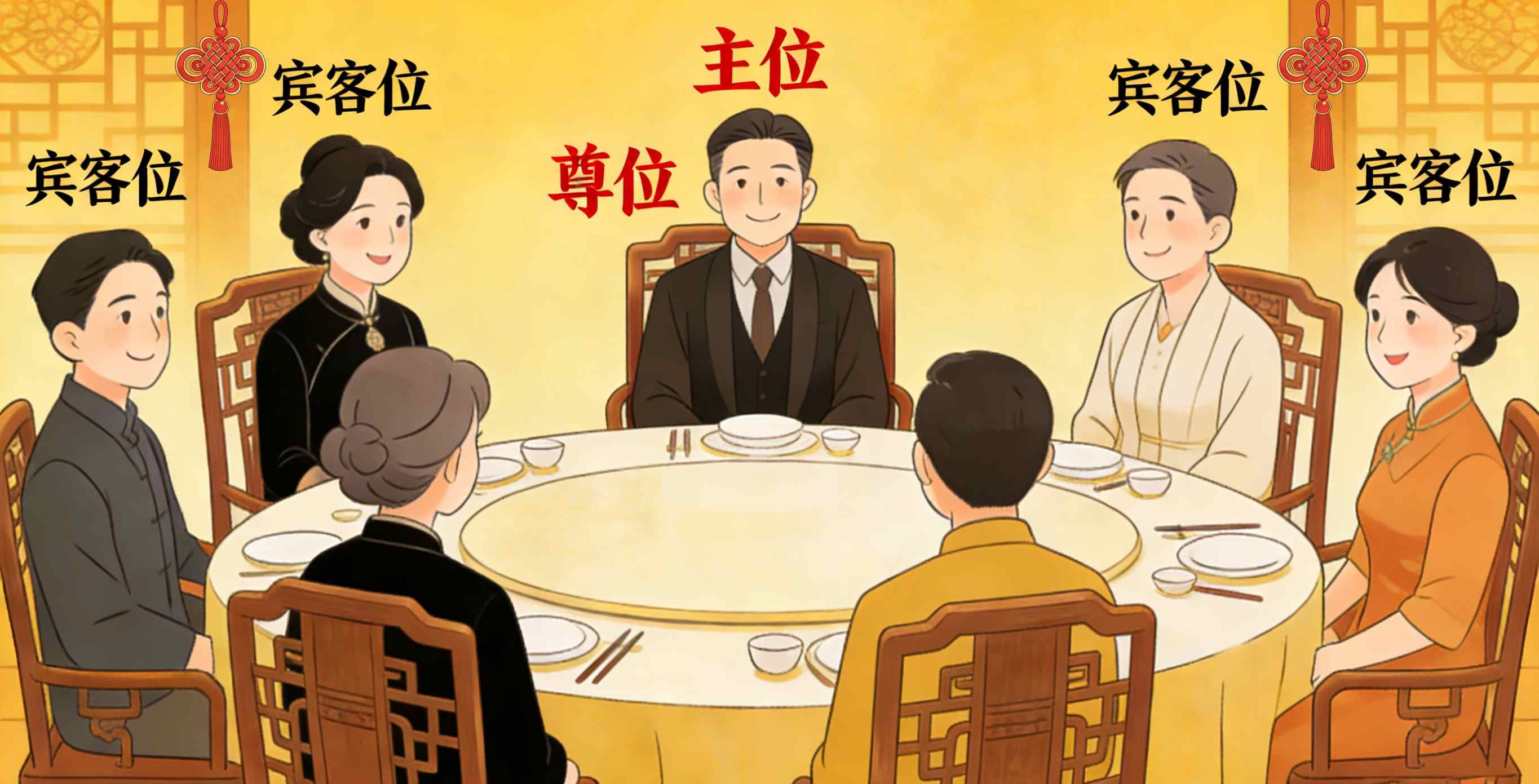 पारंपरिक चीनी बैठने की व्यवस्था में, सबसे सम्मानित स्थान आमतौर पर दक्षिण की ओर होता है, जो मेज के उत्तरी किनारे पर स्थित होता है।