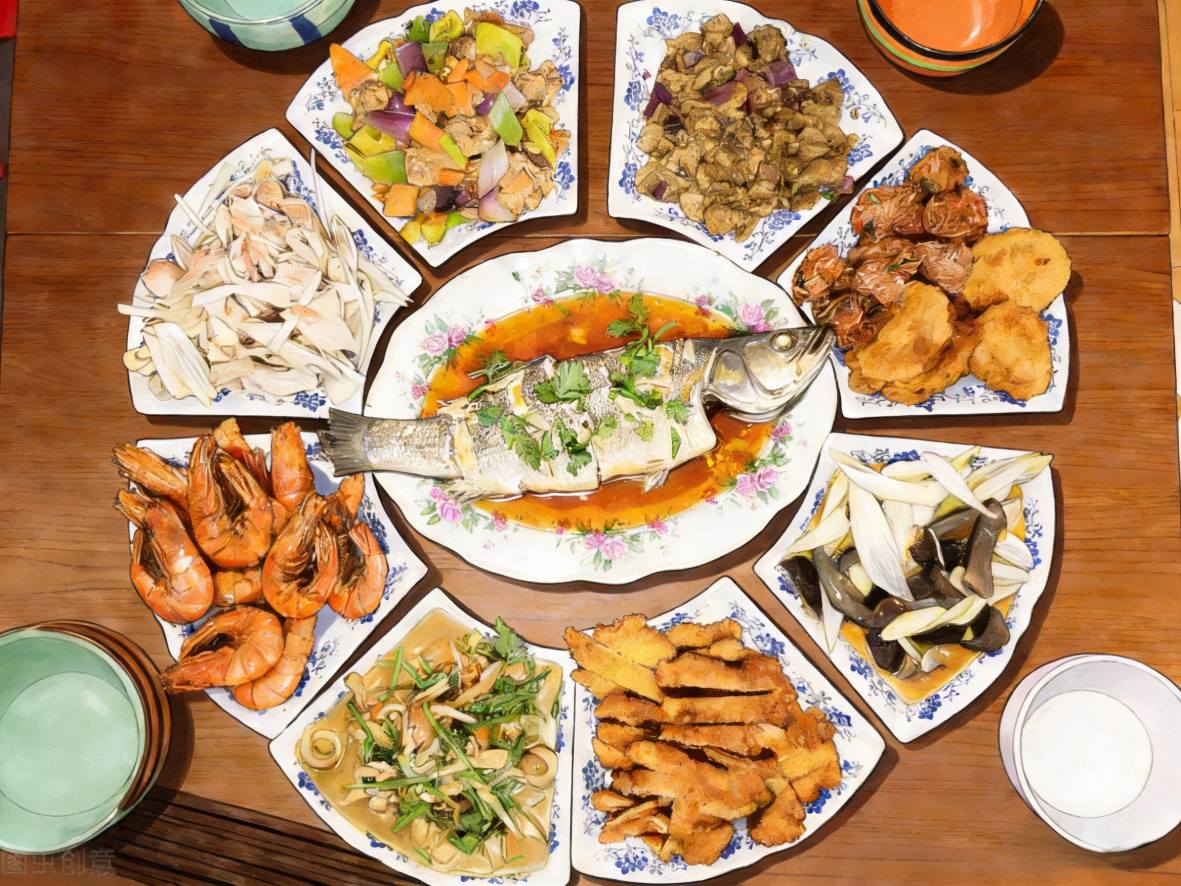 हालाँकि चीन के उत्तरी और दक्षिणी क्षेत्रों की अपनी पाक परंपराएँ हैं, लेकिन यह निश्चित है कि नए साल की शाम के रात्रिभोज में भोजन को विशेष महत्व दिया जाता है। जैसे मछली का मतलब साल-दर-साल समृद्धि की कामना करना है, चीनी में लेट्यूस का मतलब अमीर बनना है।